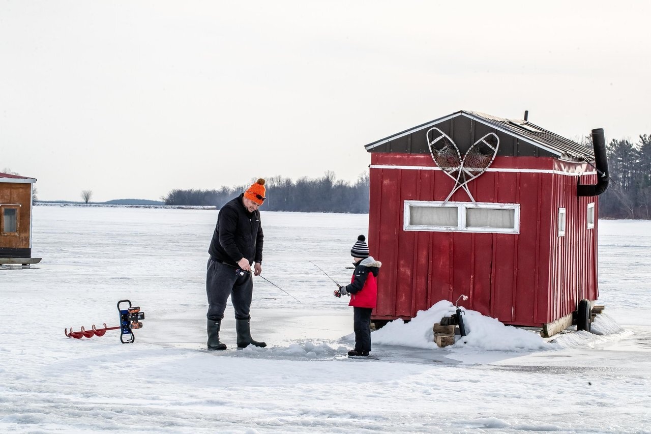 La pêche sur glace est l'une des grandes traditions canadiennes de l'hiver, et le sud-est de l'Ontario regorge d'endroits où l'on peut jeter sa ligne. Le fleuve Saint-Laurent est le point d'ancrage de la région, de Quinte à Cornwall, et les baies abritées, les chenaux gelés et les lacs intérieurs voisins offrent de tout, de la perche au brochet en passant par le doré trophée.